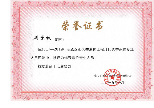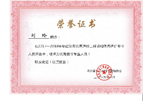 與時(shí)俱進(jìn)、開拓進(jìn)取——熱烈祝賀我司周麗等6名同志榮獲“2017-2018年度武漢市優(yōu)秀造價(jià)工程師和優(yōu)秀造價(jià)專業(yè)人員”
